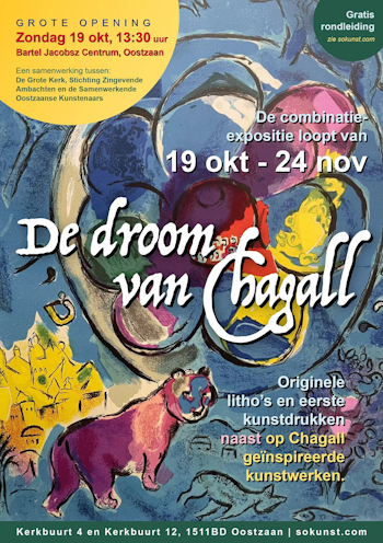 De Grote Kerk, de Stichting Zingevende Ambachten en de Samenwerkende Oostzaanse Kunstenaars hebben de handen ineen geslagen voor een combinatie tentoonstelling, geïnspireerd door de originele litho’s en eerste kunstdrukken van Marc Chagall. Deze originele litho’s en eerste kunstdrukken zijn dan ook te bewonderen, een unieke kans voor u als bezoeker. De expositie is verdeeld over 3 locaties aan het Kerkplein: