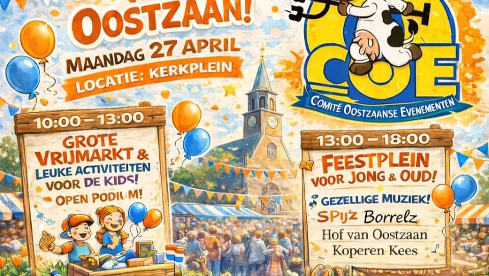 Op Maandag 27 april 2026 kleurt het Kerkplein in Oostzaan weer oranje tijdens een feestelijke viering van Koningsdag! Voor de derde keer op rij organiseren wij een gezellige en feestelijke dag voor jong en oud – en ook dit jaar belooft het weer een geweldige editie te worden. Meer informatie over het programma op www.grotekerk.nl