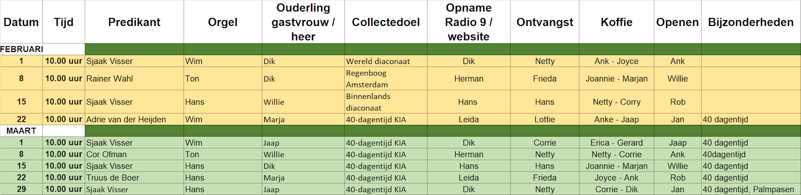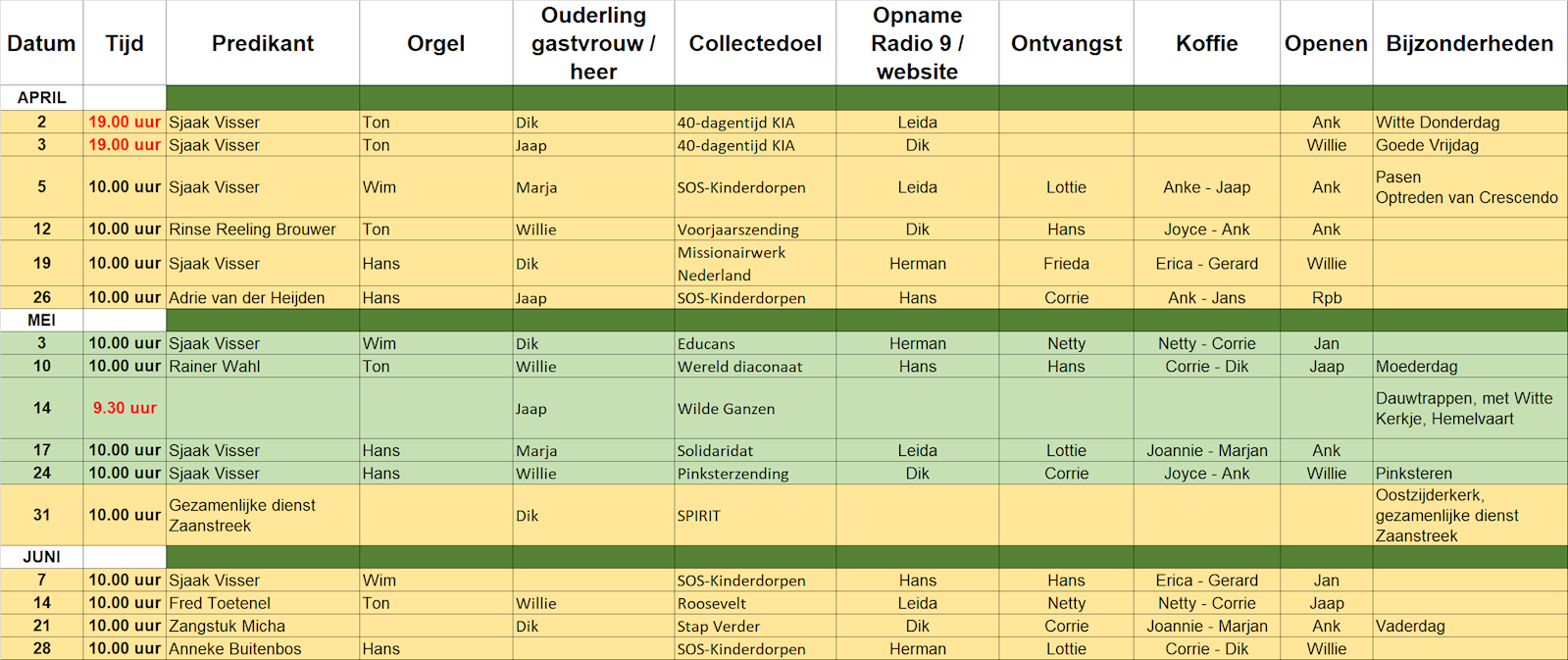 In de laatste kolom staan nog eventuele bijzonderheden. Gaarne wijzigingen in dit rooster mailen naar: